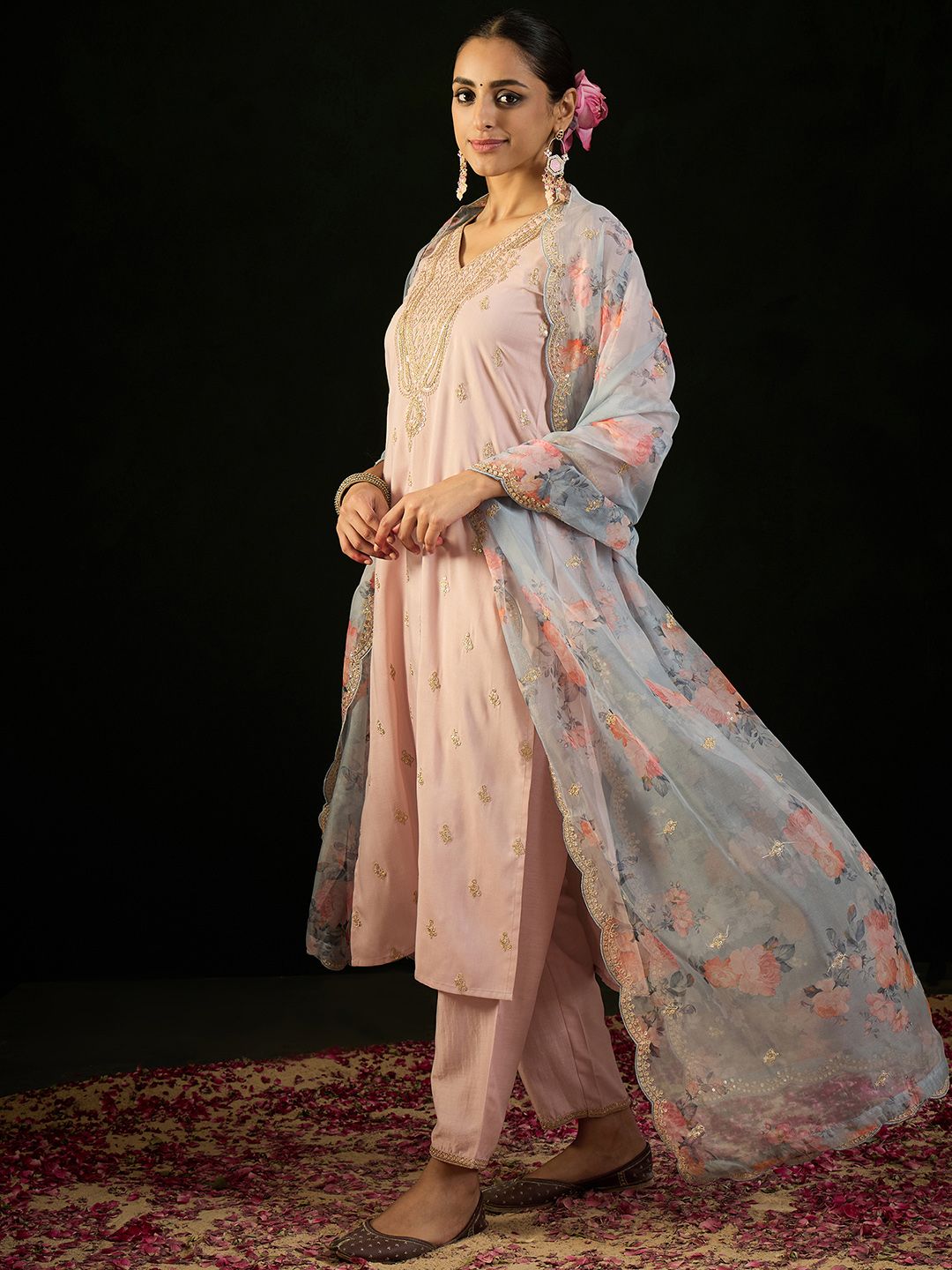Kurti, Pant, Dupatta Set: Complete 4-piece set that includes a Kurti, Pant, Dupatta, and a beautiful Perls Single Line Mala for that added touch of elegance