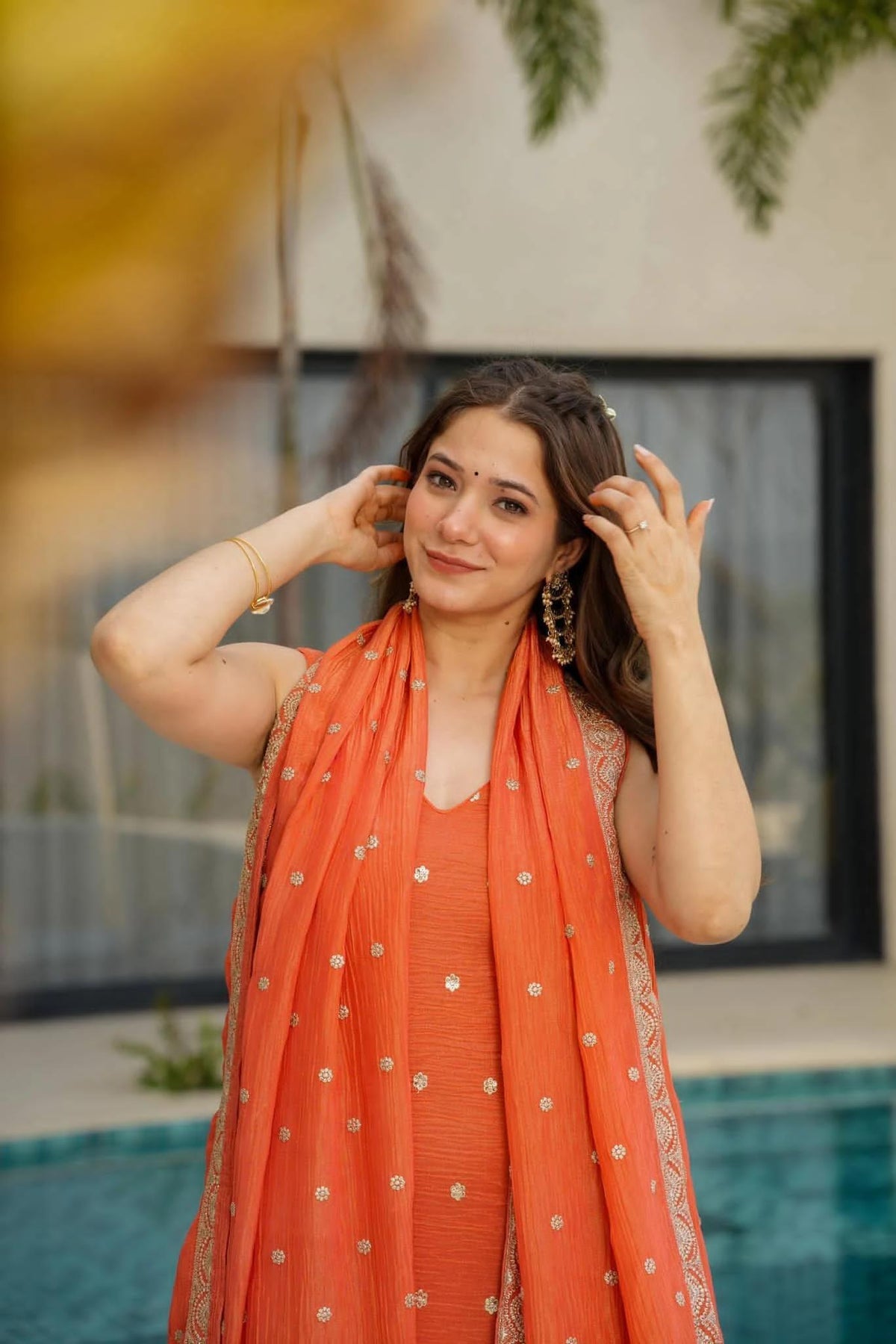Step into the spotlight this festive season with our stunning Orange Straight Suit, crafted to exude timeless charm and vibrant elegance! Made from luxurious Chinnon Silk, this ensemble features intricate embroidery, a wide-legged palazzo, and a gorgeous thread work dupatta—perfect for effortless festive glam!