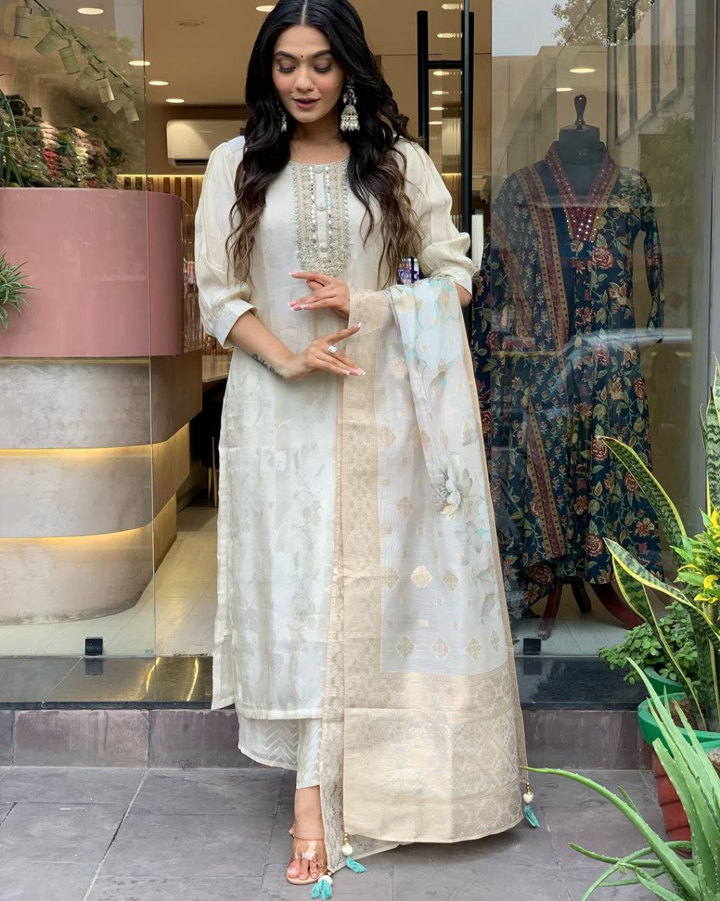 The ensemble is completed with a pure weaving zari jacquard dupatta, which beautifully complements the suit with its matching patterns and rich texture. For ultimate comfort, the set also comes with a pure cotton lining.